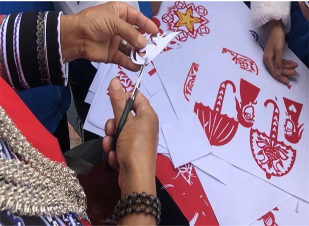 ?二、粘貼:先用米面熬制漿糊,再把剪紙按照一定的構圖關系粘貼于特制的布料晾干備用。