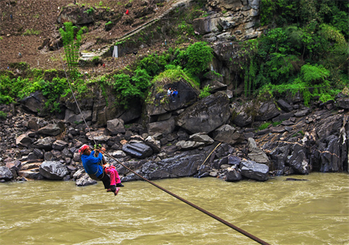 怒江州瀘水市逆河到西藏嘉玉橋部分為中段,怒江中段進(jìn)入橫斷山區(qū)后,由于地勢(shì)陡降,奔騰的怒江從1400米高度跌落,同時(shí)兩岸群峰矗立,江水暴怒無比般地從山縫間擠身流泄,仿佛一條被激怒的巨龍,發(fā)出轟鳴。怒江“老虎跳”地段兩山聳峙,猶如刀削斧劈,水急浪高,巨石密布。被譽(yù)為“怒江第一險(xiǎn)灘”,在國(guó)際極限漂流界享有盛名,被世界激流皮劃艇愛好者稱為“白水天堂”。