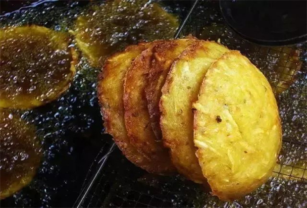 洋芋粑粑:把洋芋洗好蒸熟后去皮,放入碓窩里舂成又粘又糯的“洋芋粑粑”。食用前若拌點蜂蜜,其味甜香可口;若放油、鹽煎熱吃,其味鮮美清香;或者把洋芋粑粑切成小塊,放進(jìn)油鍋內(nèi)炸黃食用,味道脆香可口。