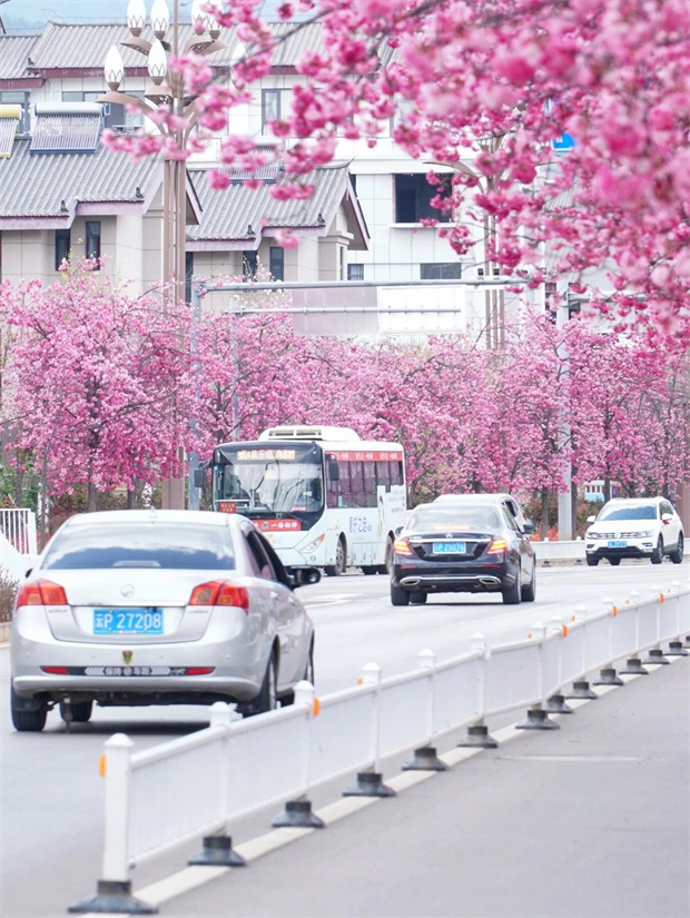 香格里大道上,櫻花沿著寬闊的道路整齊排列,像是大自然精心設(shè)置的迎賓隊(duì)伍。道路上車水馬龍,卻在櫻花的裝點(diǎn)下