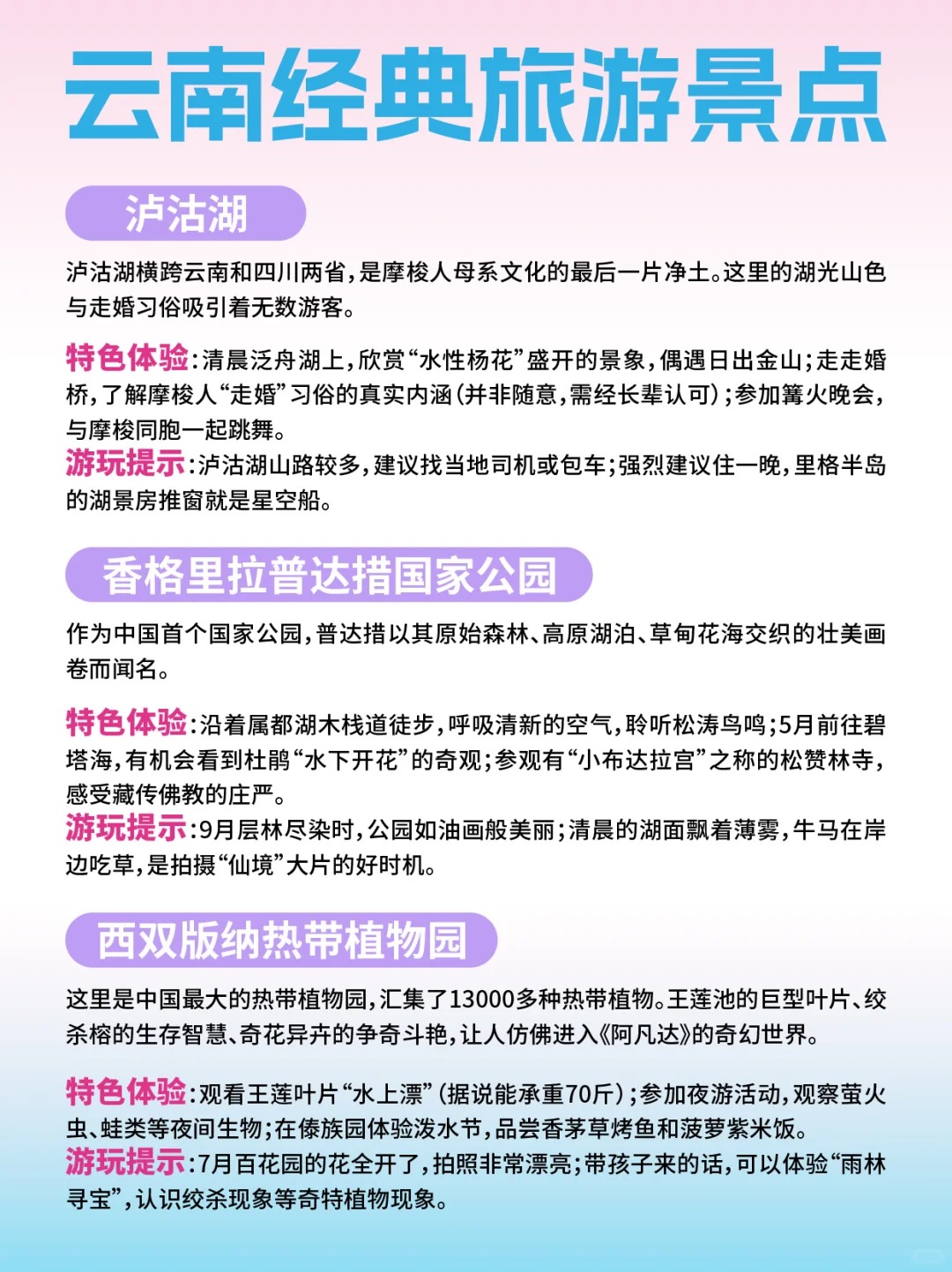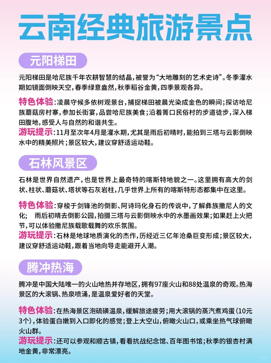 想來(lái)云南旅游的小伙伴,這是一份云南經(jīng)典旅游景點(diǎn)的詳細(xì)介紹,希望能幫助你更好地規(guī)劃行程
