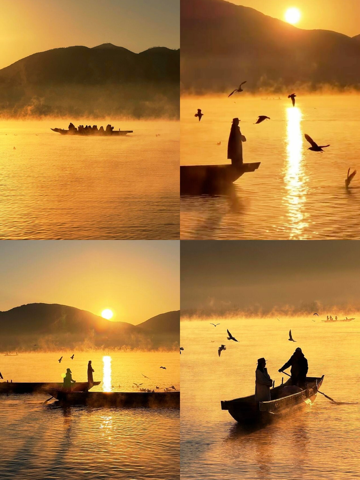 8:00 金光穿霧:太陽一出來絕了!霧氣從乳白變成香檳色,金斑撒在湖面上,紅嘴鷗追著船飛,伸手就有小家伙來啄魚干,高速連拍根本停不下來