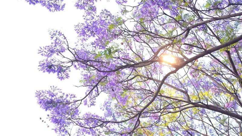 四月開始,開遠(yuǎn)的藍(lán)花楹率先登場。伸展的枝丫盛滿藍(lán)紫色的花朵,