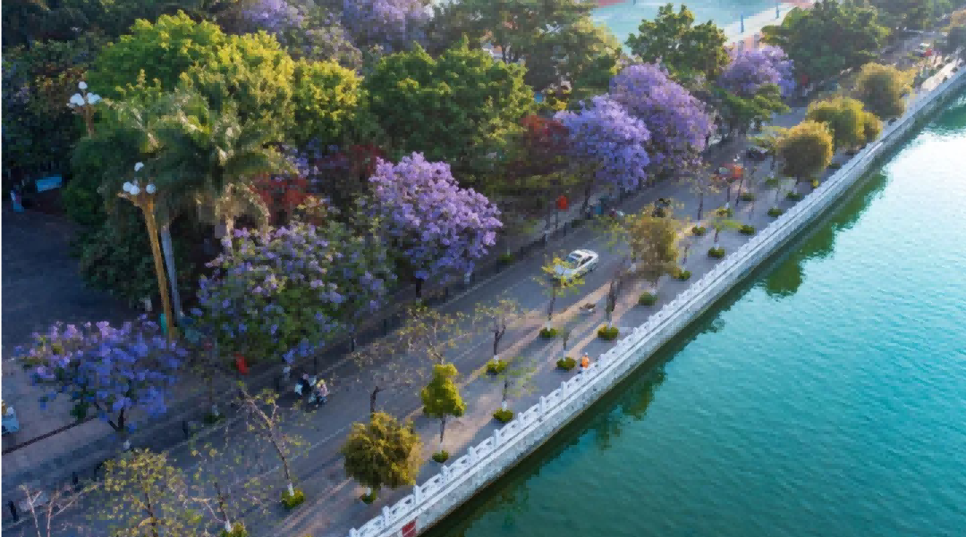 蒙自尼蘇小鎮(zhèn)的藍(lán)紫色夢幻長廊不容錯過,藍(lán)花楹沿著大屯海邊盛放,航拍視角下美得令人震撼。